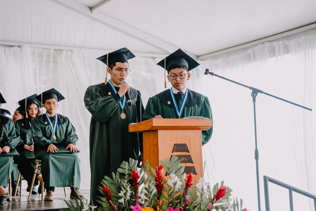 En esta ceremonia, los alumnos destacados en ciencias, Marcos Sebastián Sánchez Estrada y Daniel Fernando Xiquín Tezén, pronunciaron un emotivo discurso en representación de sus compañeros, compartiendo sus reflexiones sobre la formación recibida y los aprendizajes adquiridos durante su paso por el colegio.